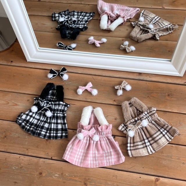 チェック柄のワンピースにエコパーのショルダーストラップを加え、エレガントながらもラブリーなムードで仕上げました。