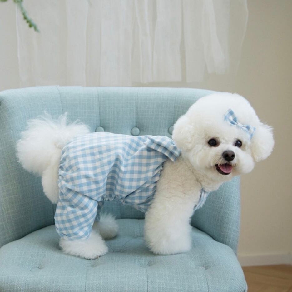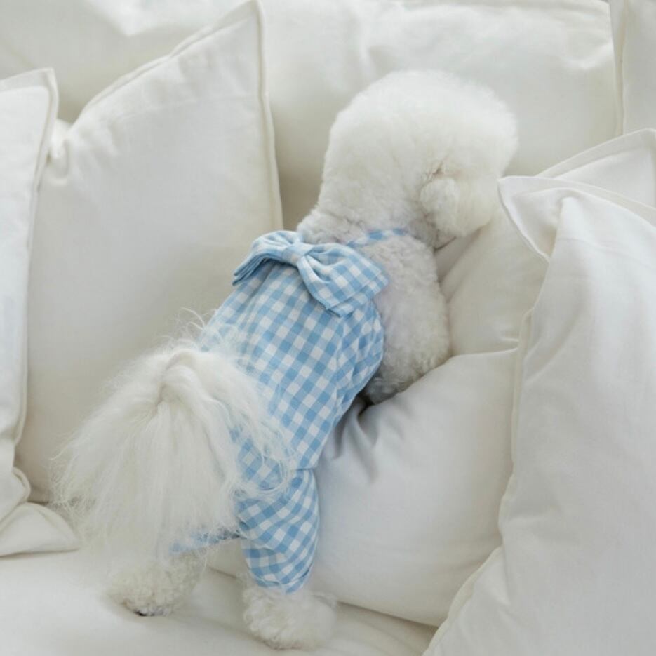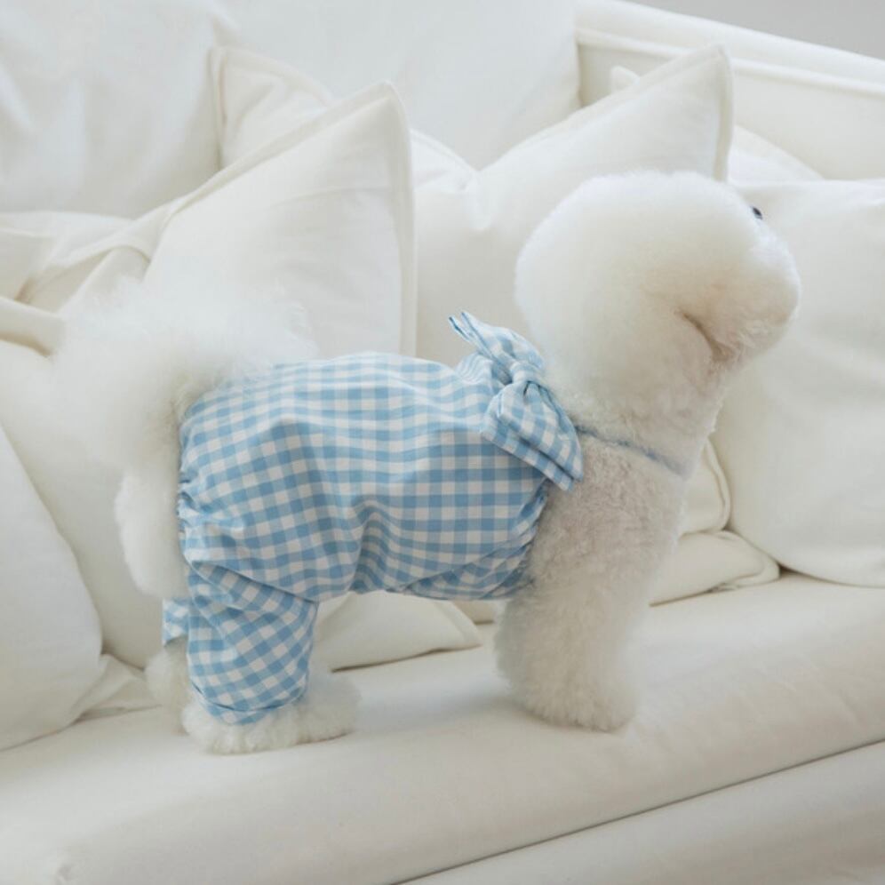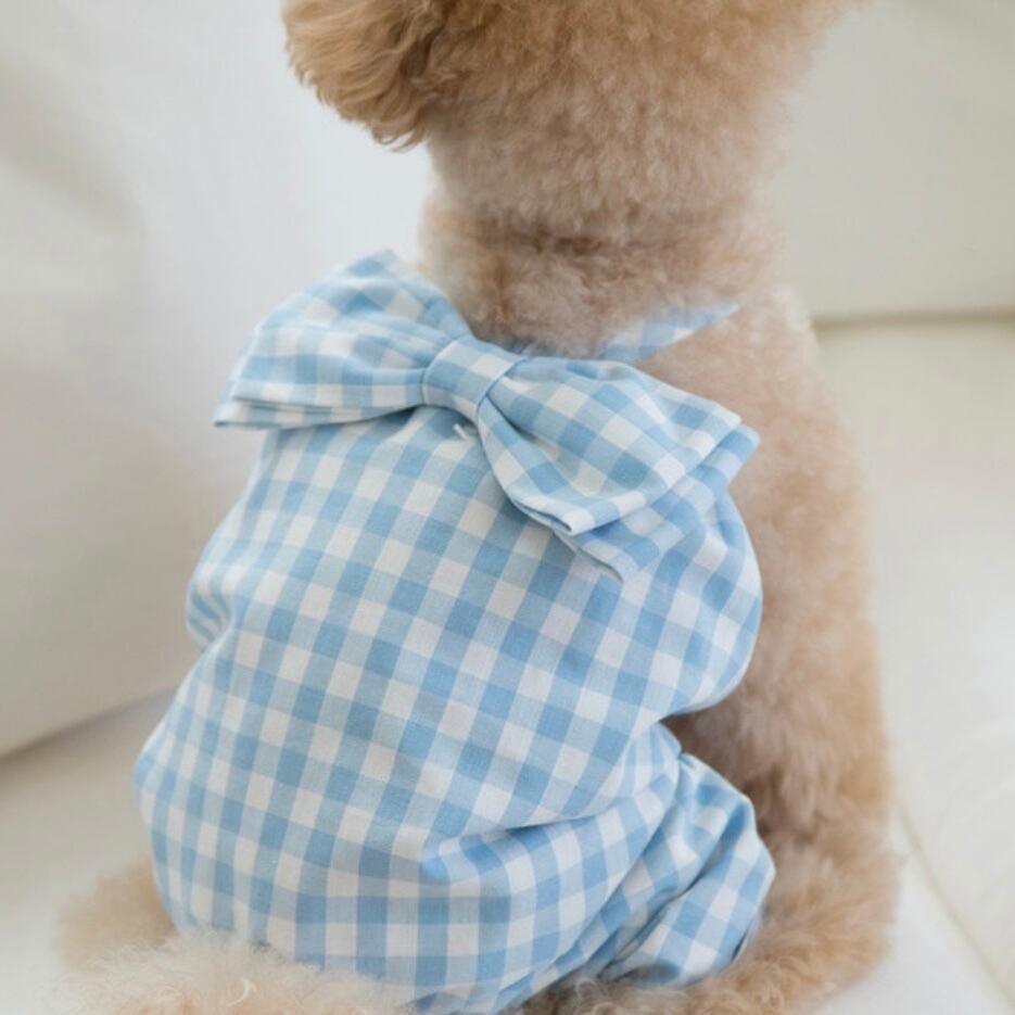 オールインワンでも活動性を維持しながら可愛い愛犬たちが活発に走っても可愛い背中にビッグリボンがポイントになるように制作しました。