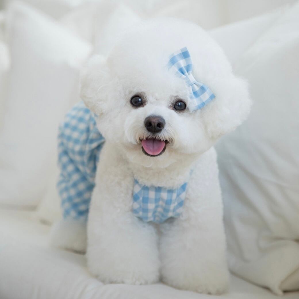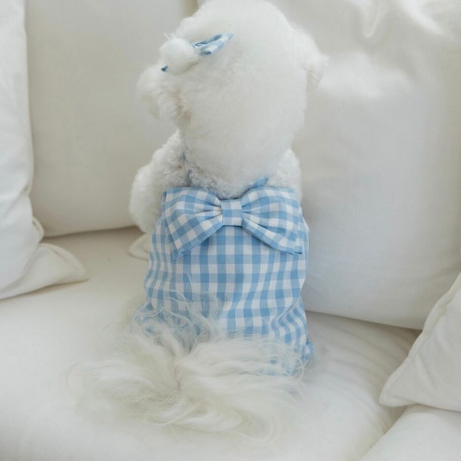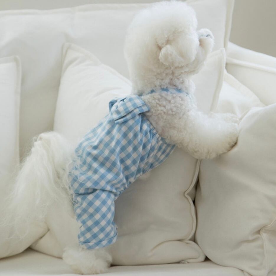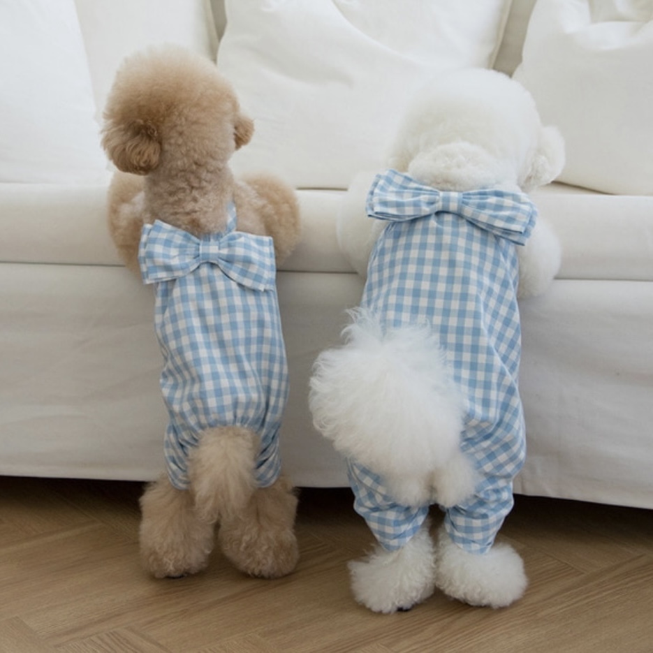 オールインワンでも活動性を維持しながら可愛い愛犬たちが活発に走っても可愛い背中にビッグリボンがポイントになるように制作しました。